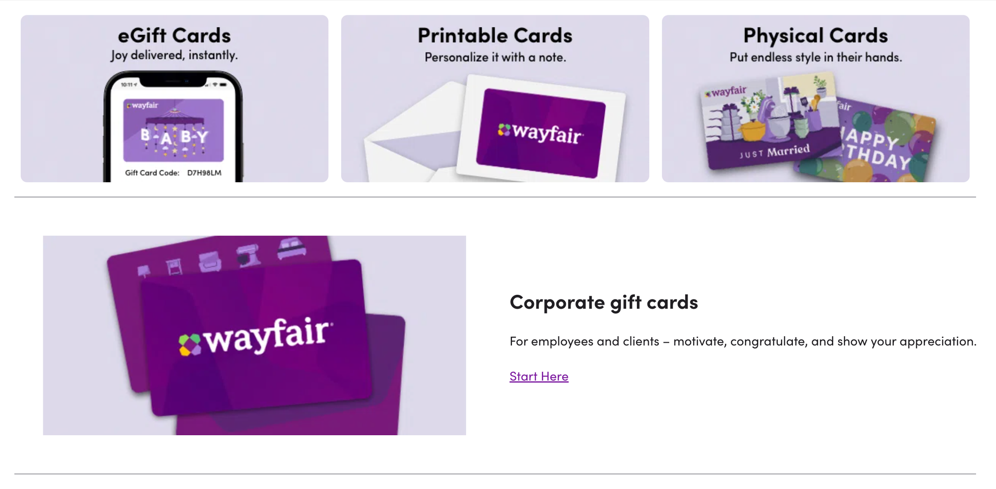 - Corporate Gift Cards: Wayfair also offers corporate gift cards, which are commonly used for employee rewards, promotional giveaways, or customer appreciation. These cards function the same way as standard Wayfair gift cards but can be purchased in bulk.