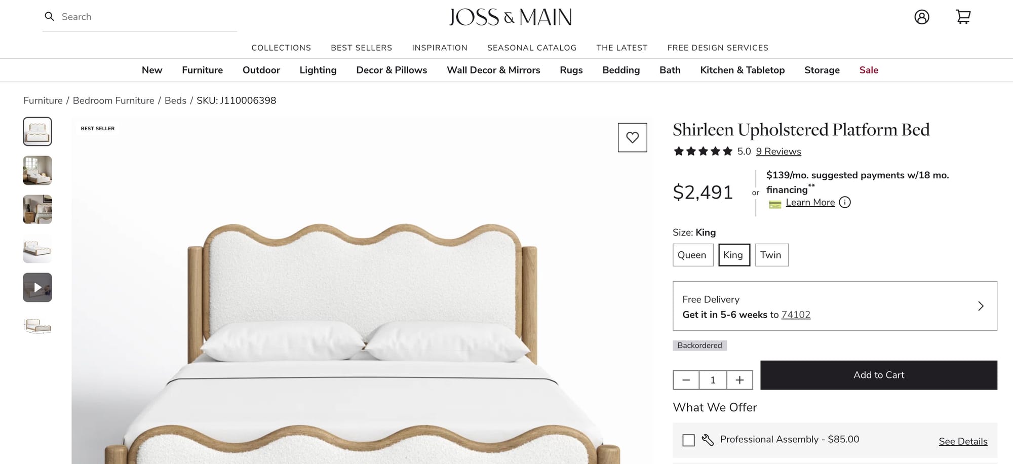 - Shipping: Free standard shipping is available on orders over $35, which this bed easily qualifies for. “Free shipping” in this case means a standard curbside/threshold delivery at no extra charge. Typically, the carrier will schedule a delivery appointment for large items. Joss & Main/Wayfair often also include Free Room-of-Choice or Full-Service Delivery on very high-end items, meaning the carrier would bring it inside and set it up at no added cost.