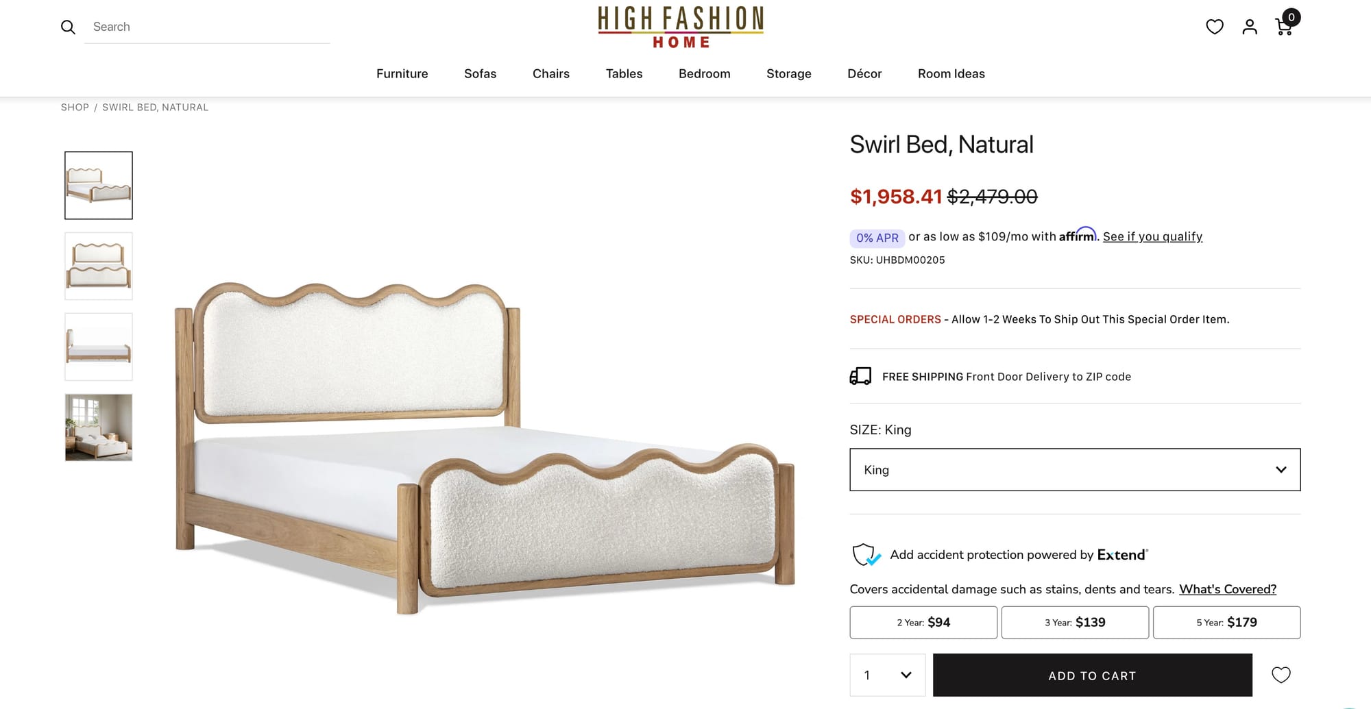 - Financing: High Fashion Home provides financing through Affirm (advertised as 0% APR for qualified buyers).
