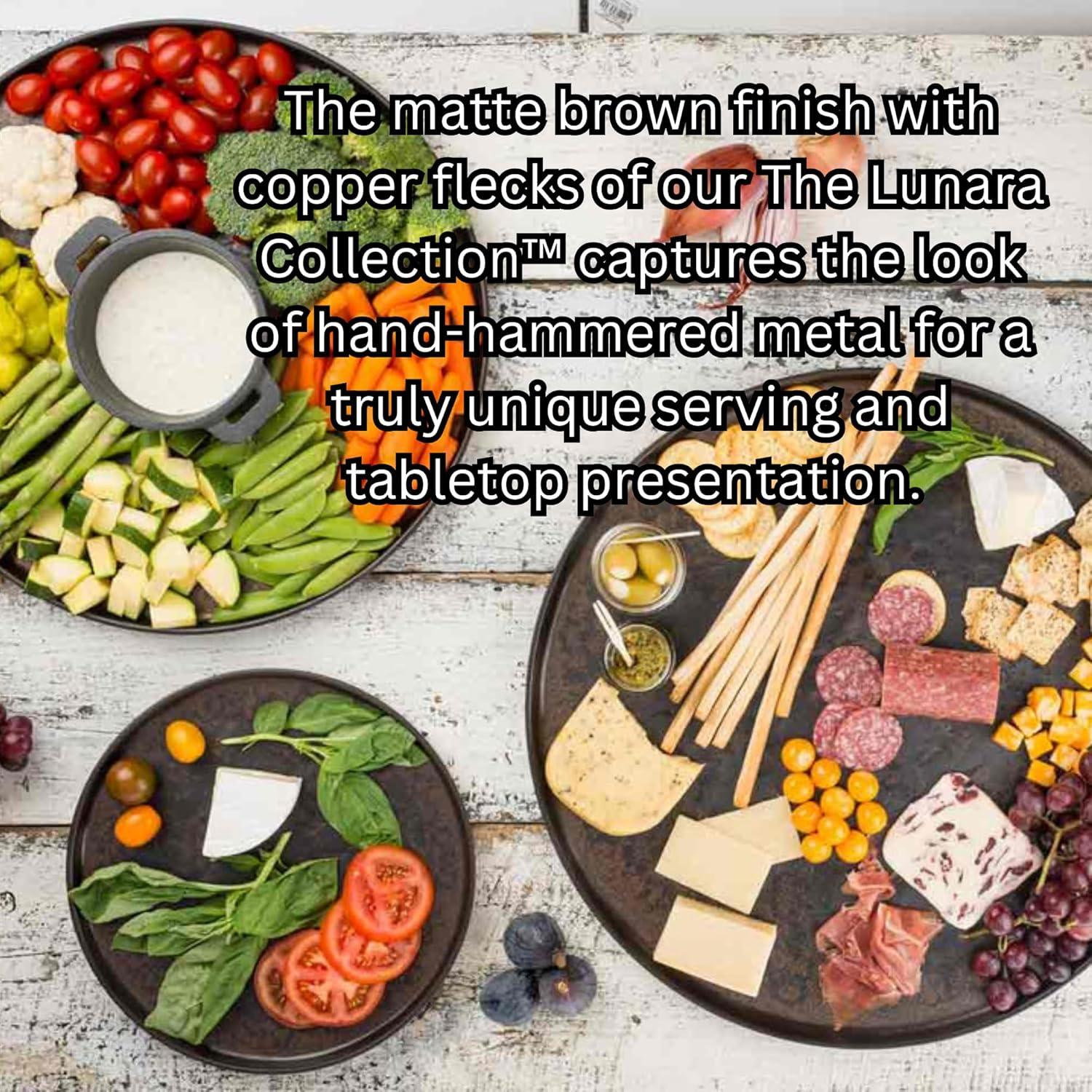 Elevate your dining experience with this 10.75" round melamine tray. Its sleek brown design is perfect for serving appetizers, entrees, or desserts. Durable and dishwasher safe, this tray is ideal for both casual and formal occasions.