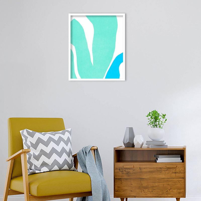 Elevate your space with this striking teal and blue abstract wall art. The vibrant colors and minimalist design evoke a tropical feel, perfect for modern and coastal interiors. Framed in 100% real wood, this piece is giclee printed with fade-resistant inks for lasting beauty.