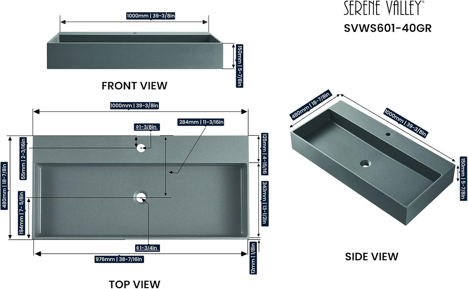 40 in. Wall-Mount or Countertop Install, Bathroom Sink with Single Faucet Hole in Matte Gray