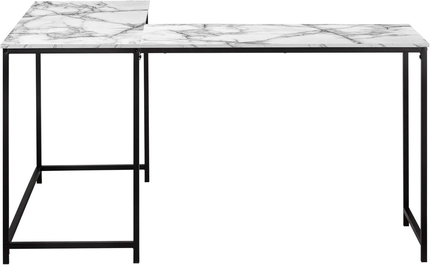 Maximize your workspace with this sleek L-shaped desk. The white marble-look laminate top and black metal base offer a modern, minimalist design. Ideal for corners, it provides ample room for your computer, office supplies, and decorative items, while the open base ensures generous legroom.