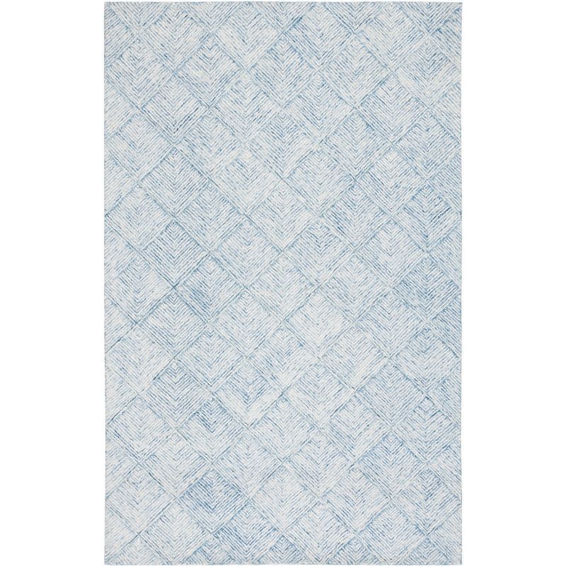 Elevate your space with this hand-tufted wool area rug, featuring a modern abstract design in grey and turquoise. Its texture-rich loop pile offers a comforting feel underfoot, making it a perfect addition to any room.
