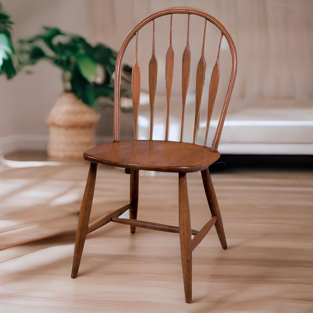 This classic side chair offers traditional charm and comfort with its slat back design. Crafted from durable beechwood and finished with a sealed and lacquered antique brown stain, it adds a rustic touch to any dining space.