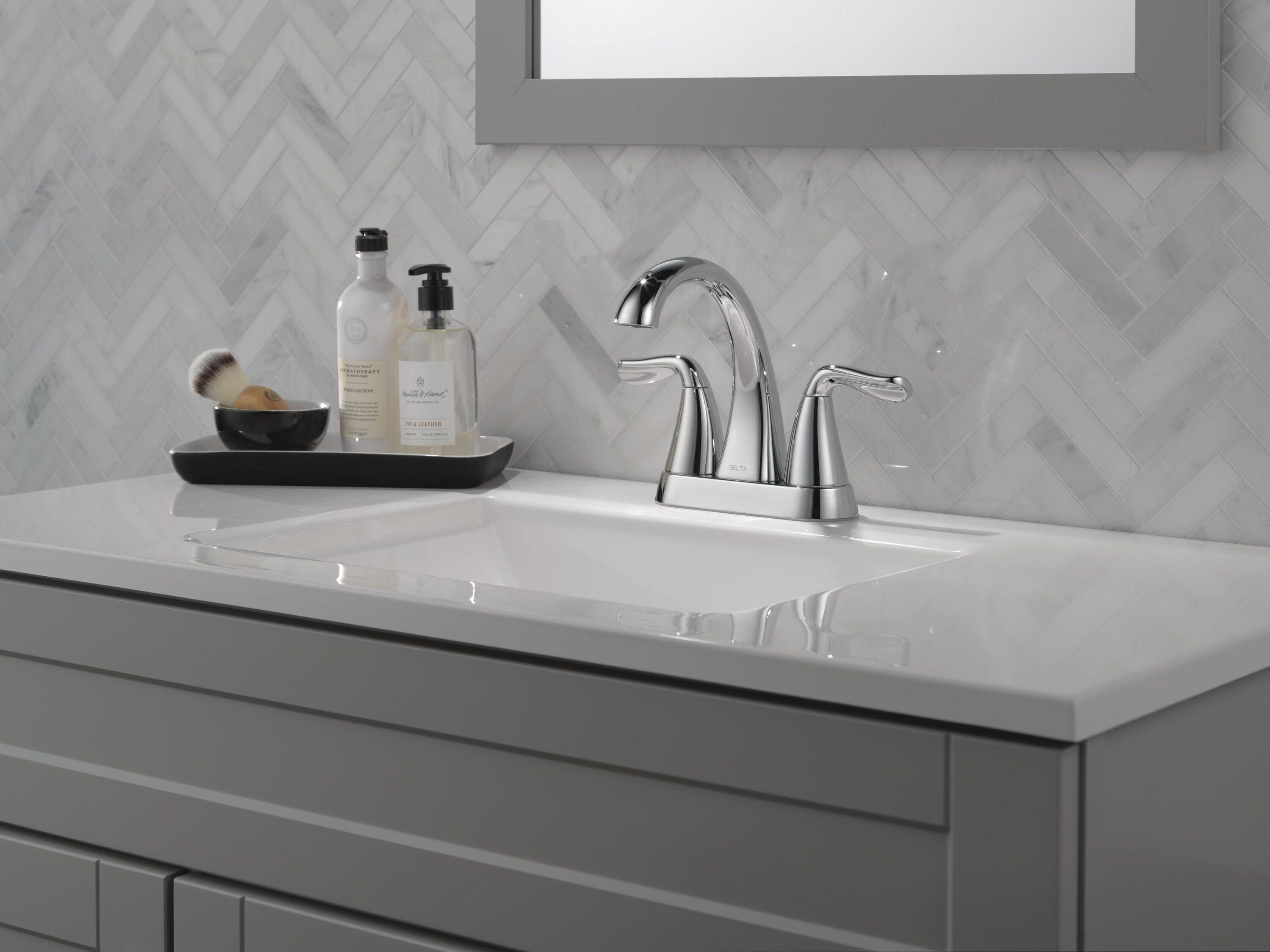 L Lowe's Delta Arvo Chrome 4-in centerset 2-handle WaterSense High-arc Residential Handle Bathroom Sink Faucet with Drain | $94.87 |