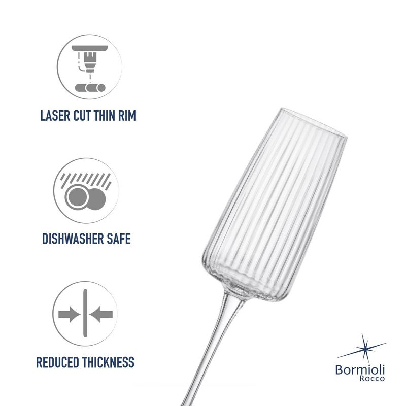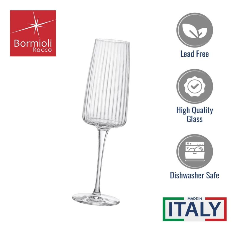 Elevate your celebrations with this set of 4 Bormioli Rocco Prosecco glasses. Crafted from crystal-clear glass with a ribbed design, these 8.5 oz flutes offer elegance and durability. Perfect for any occasion, they enhance the visual appeal of your beverages.