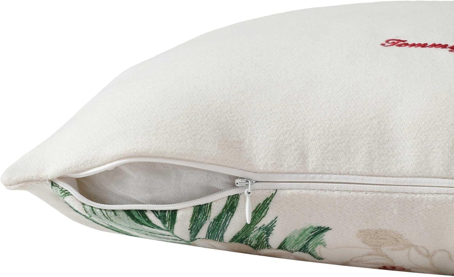 Bring a touch of holiday charm to your home with this embroidered floral pillow. Featuring vibrant red flowers and lush green leaves on an ivory background, this rectangular pillow adds a festive and cozy feel to any space. The removable cover is machine washable for easy care.