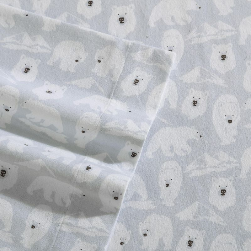 Enjoy cozy nights with this gray cotton flannel sheet set featuring a charming bear print. Made from 100% cotton, these sheets are brushed for extra softness and warmth, perfect for colder months. The set includes a flat sheet, fitted sheet, and pillowcases, all designed to fit snugly and stay in place. Machine washable for easy care.