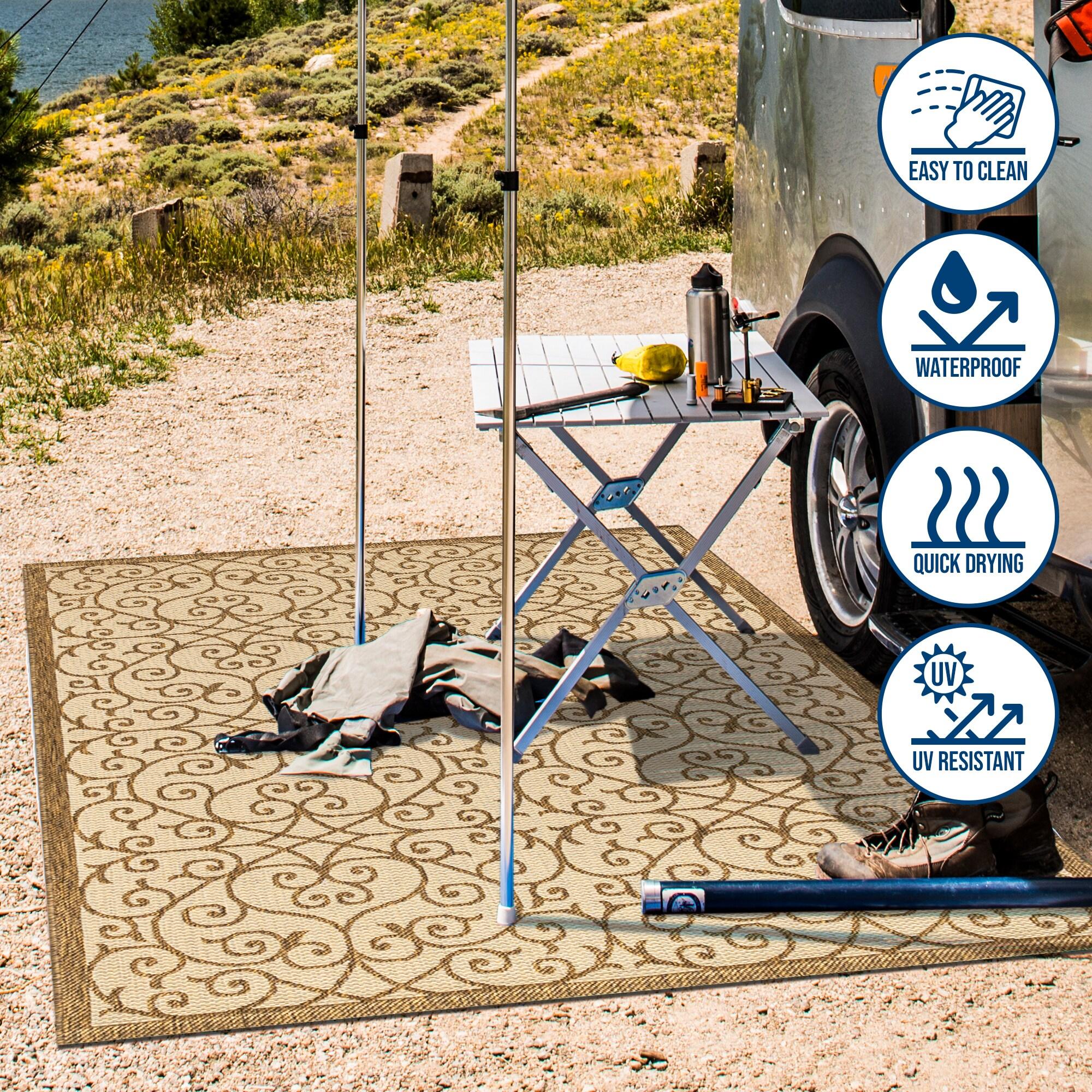 Elevate your living space, indoors or out, with this Boho-chic rug featuring a Spanish wrought iron-inspired filigree design. Crafted for versatility, its durable synthetic fibers are stain-resistant and easy to clean, making it perfect for high-traffic areas and pet-friendly homes. Its flat weave and hand-woven texture in ivory and brown tones bring a vintage vibe to any setting.