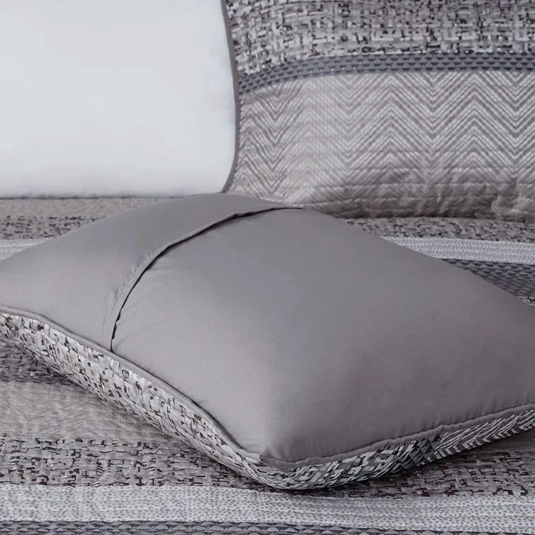 Elevate your bedroom with this luxurious King Grey and Taupe Jacquard Comforter Set. Featuring a chic stripe design with matching shams, bed skirt, and decorative pillows, it offers a sophisticated update. Machine washable for easy care.