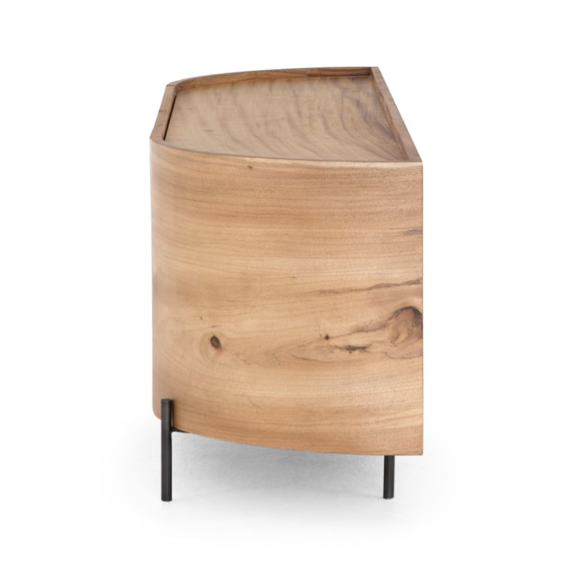 Elevate your living space with the Lunas Media Console, a masterpiece that combines contemporary charm and modern elegance. Crafted from richly textured gold Guanacaste with bronzed iron accents, this media console offers a sophisticated silhouette. Its soft shaping and inset top, inspired by classic jewelry settings, ensure it stands out as a refined statement piece. Perfect for those seeking a blend of style and functionality, it's designed to be cherished for years.