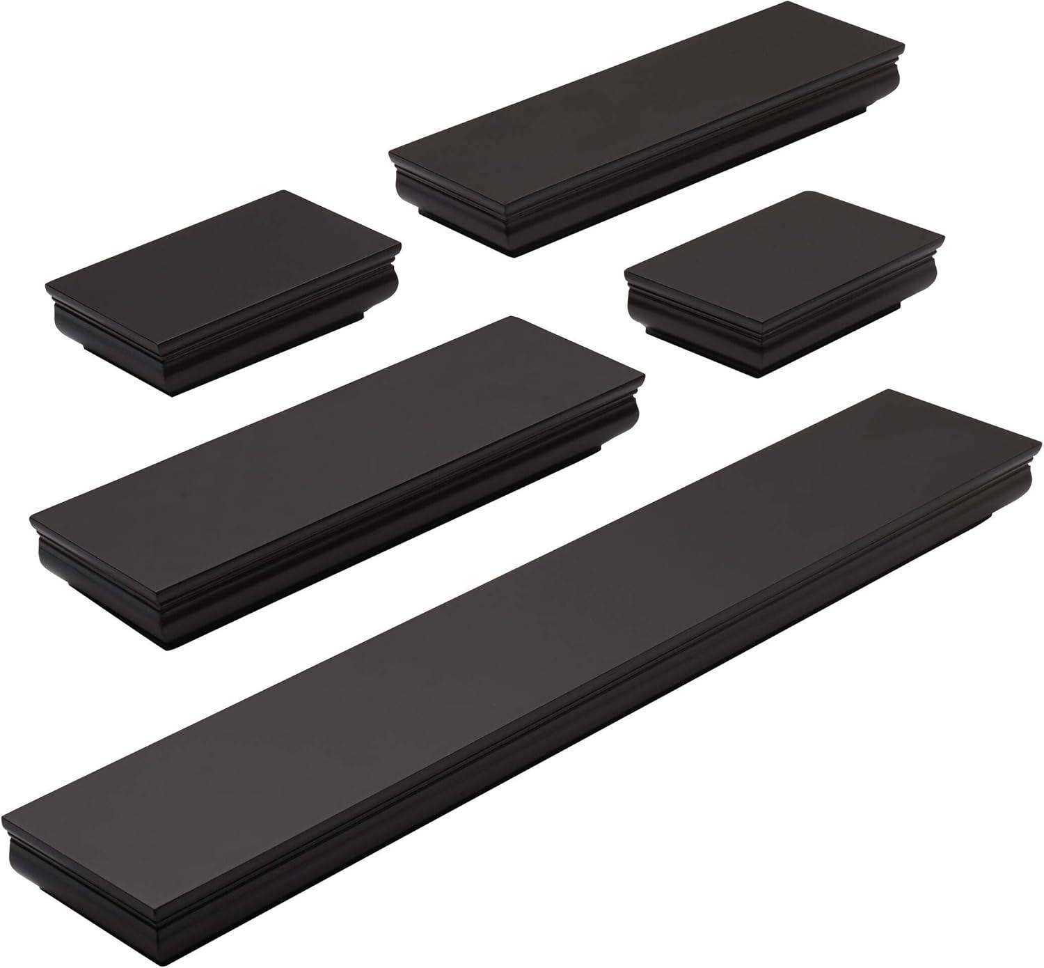 Enhance your space with this set of 5 espresso wood floating wall shelves. Perfect for displaying books, vases, and photos, these shelves add a touch of modern elegance and rustic charm to any room. Easy to hang with included hardware, create your unique wall display effortlessly.