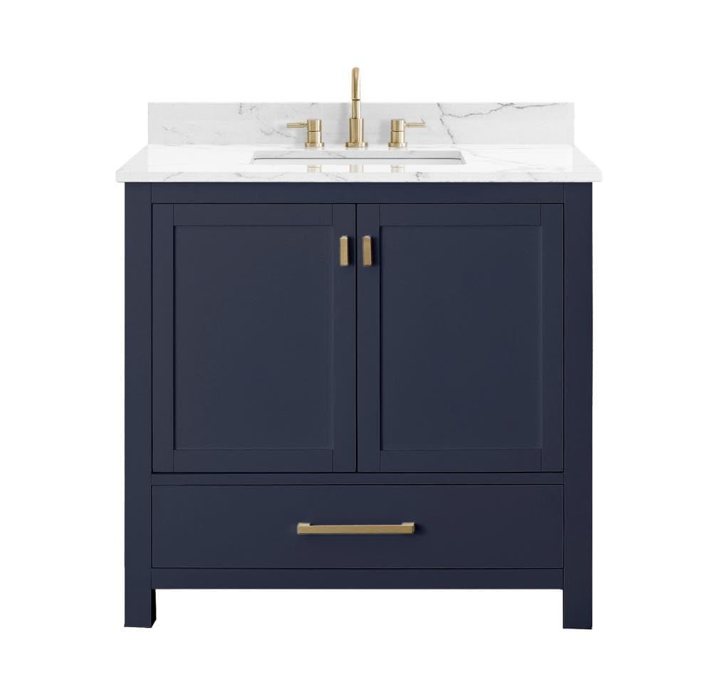 Navy Blue Solid Wood Single Sink Vanity with Stone Top - Navy Blue - Cala White Marble - 37-in single sink