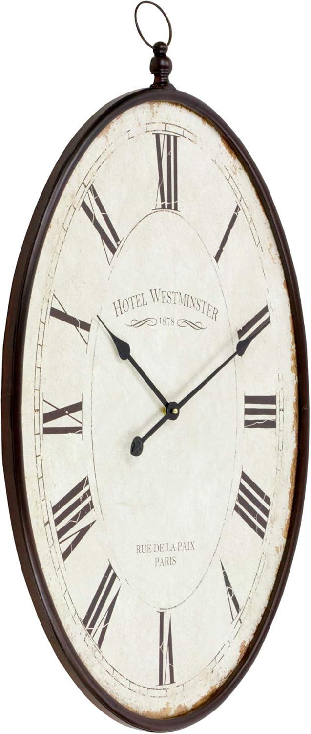 Elevate your decor with this oversized oval wall clock, featuring a charming rustic design. The dark Roman numerals and hands stand out against the off-white face, making it a functional and stylish focal point for any room.