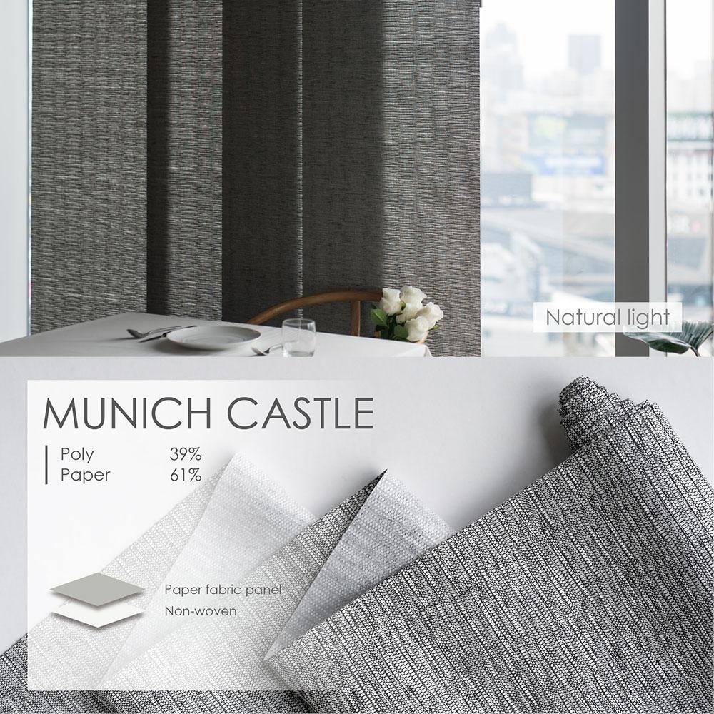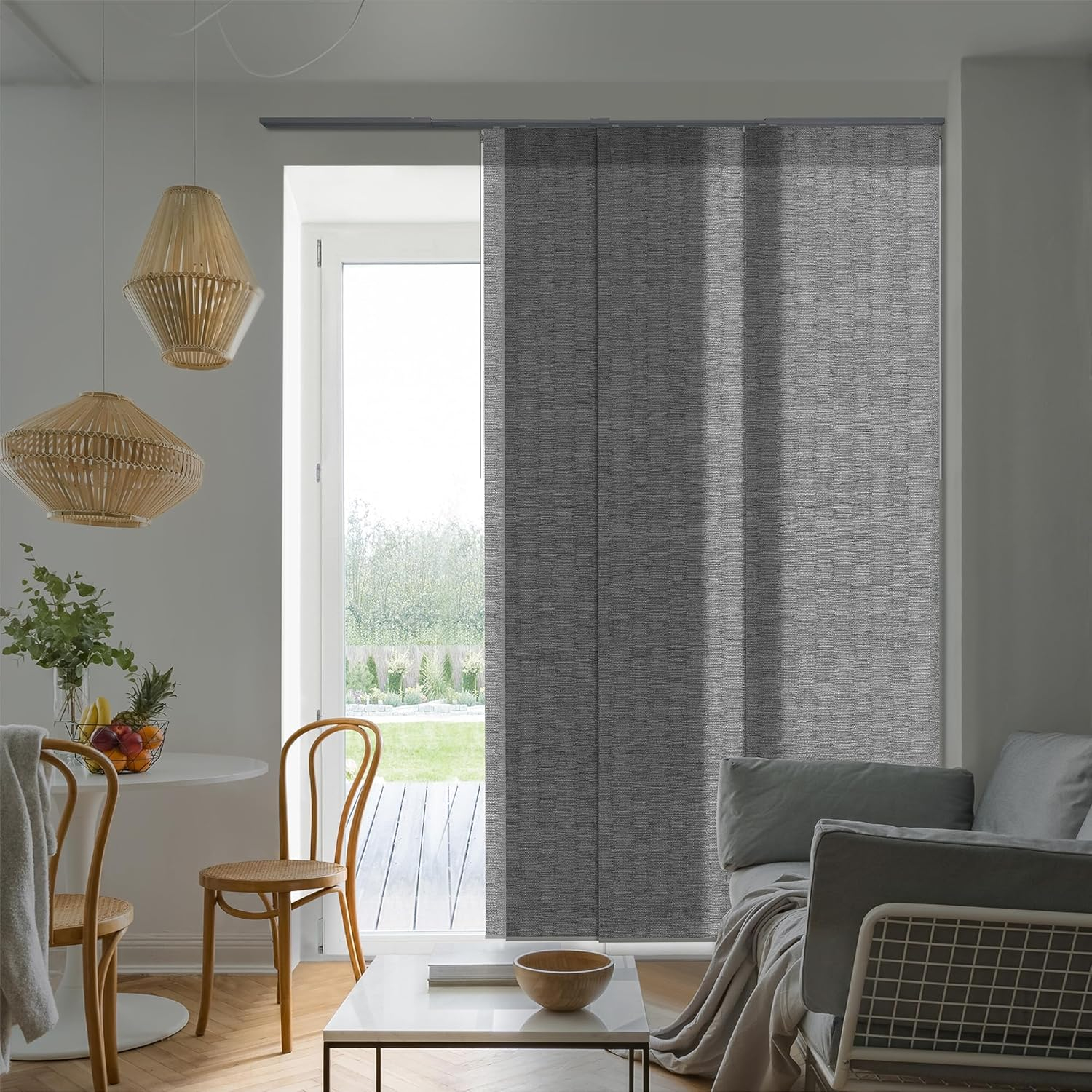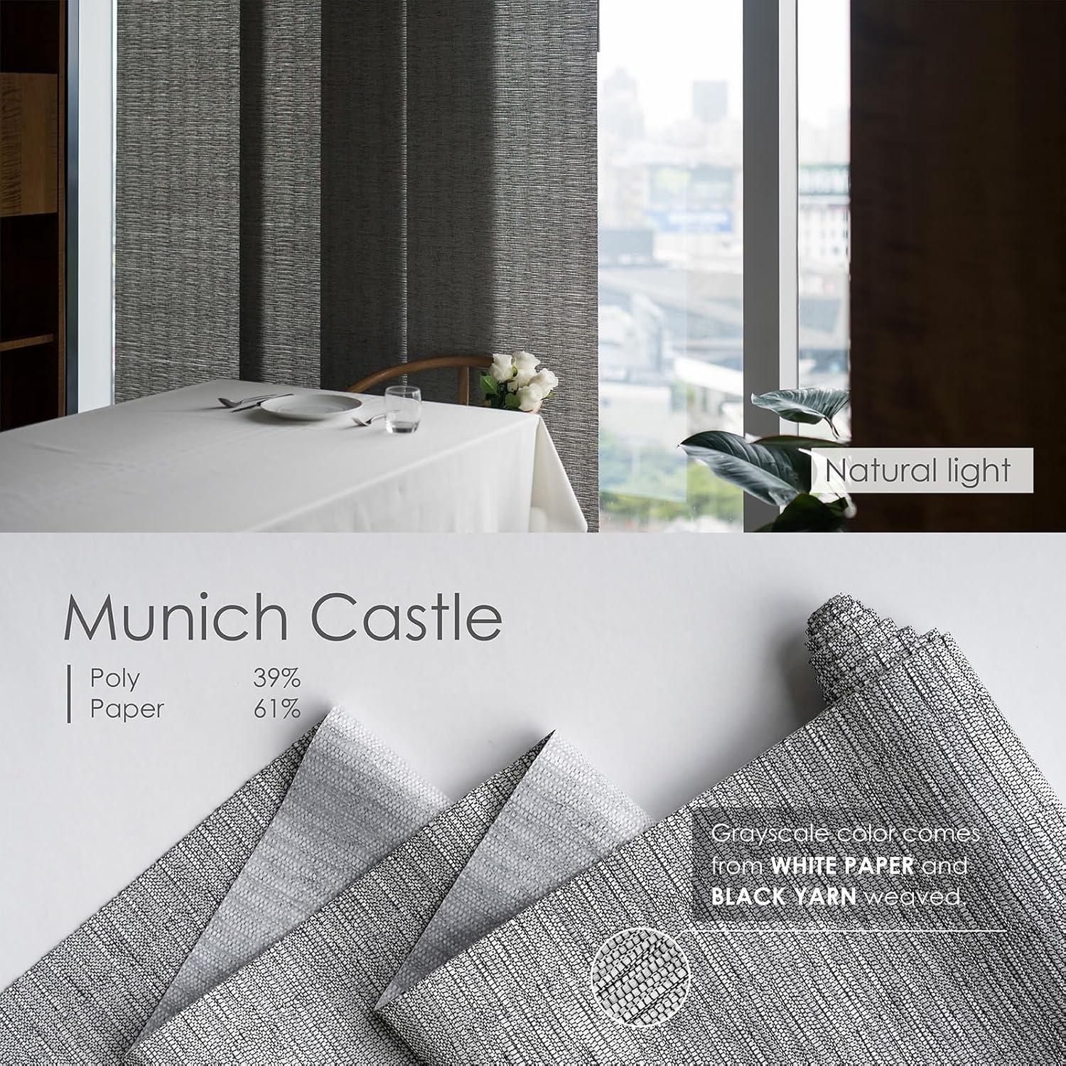 Elevate your space with the Munich Castle Gray Cordless Woven Fabric Sliding Panel Track Blind. Perfect for large windows, patio doors, and room dividers, these blinds offer a sleek, modern look with easy installation and child-safe features. Adjustable width ensures a perfect fit, while the durable fabric provides privacy and light filtering.