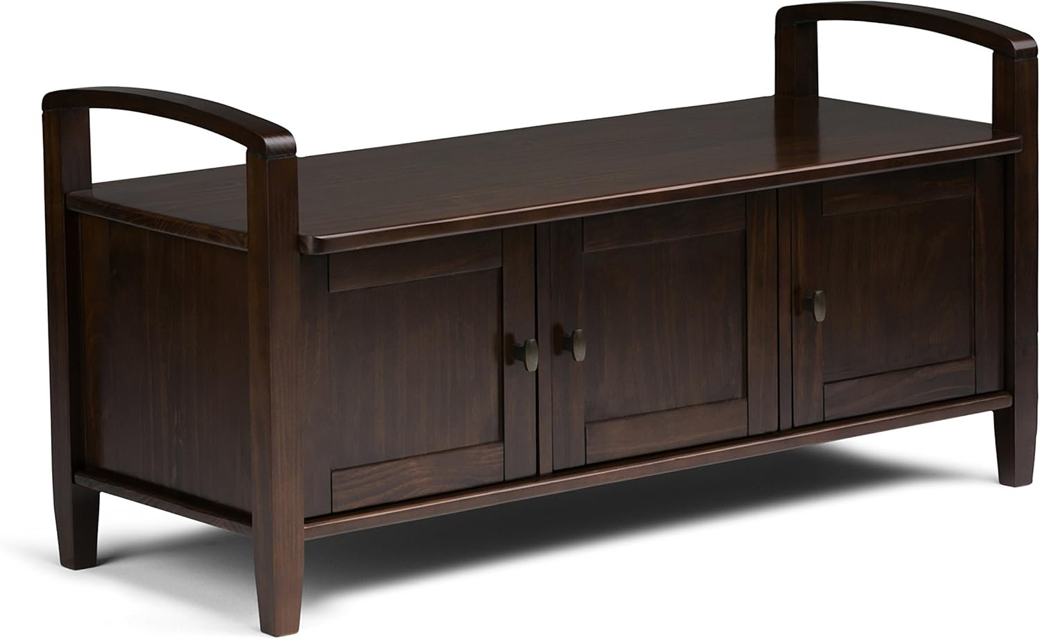 Elevate your entryway with this Rustic Natural Aged Brown Storage Bench. Crafted from the finest solid wood, it offers a stylish solution for added seating and storage. Featuring three enclosed compartments, it seamlessly combines functionality with design, making it an essential piece for any mudroom or living space.