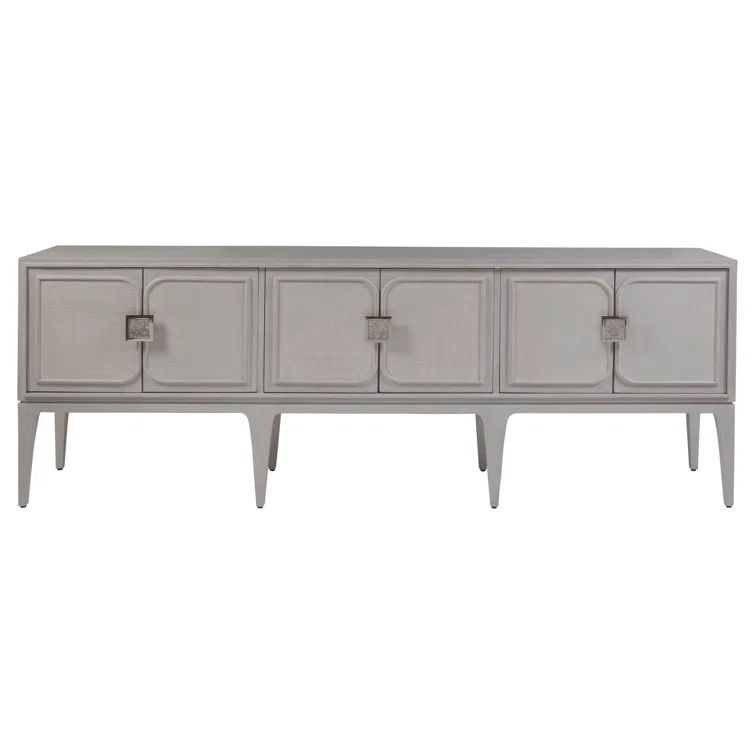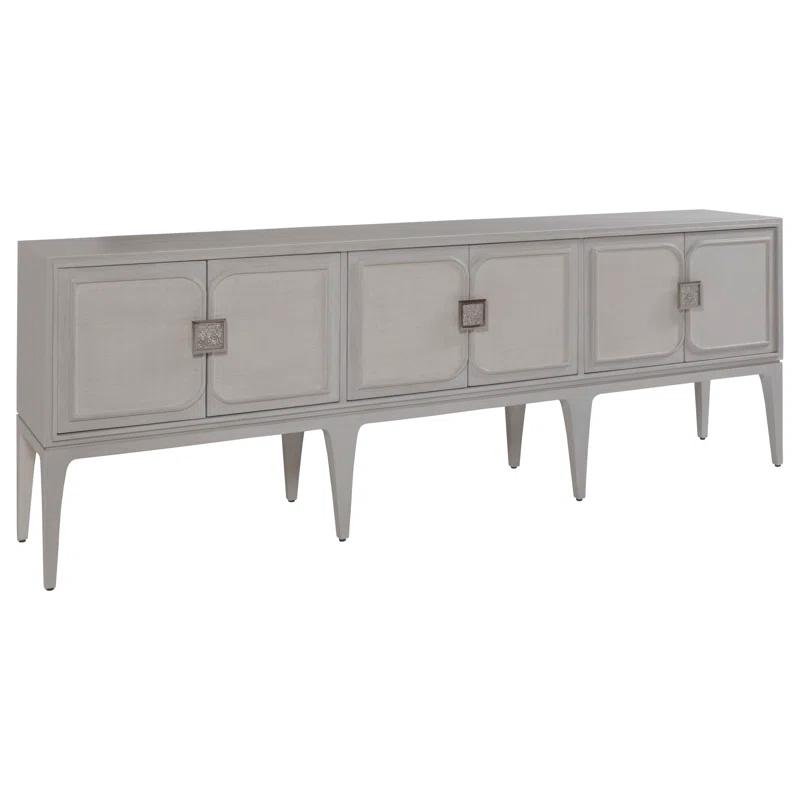 Elevate your living space with this elegant media console, featuring deeply sandblasted quartered oak veneers and sophisticated raffia door panels in a misty grey finish. Brass hardware with silver leaf accents, adjustable shelves, and ventilated sliding back complete this transitional design.