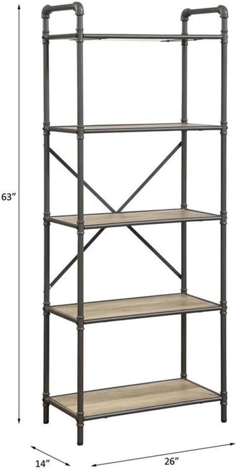 Embrace the elegance of urban industrial design with this sleek, 5-tier bookcase. Featuring a stunning combination of antique oak and sandy gray, it offers both form and function for your space. Perfect for showcasing your favorite books and decor with its open-back design and durable construction.