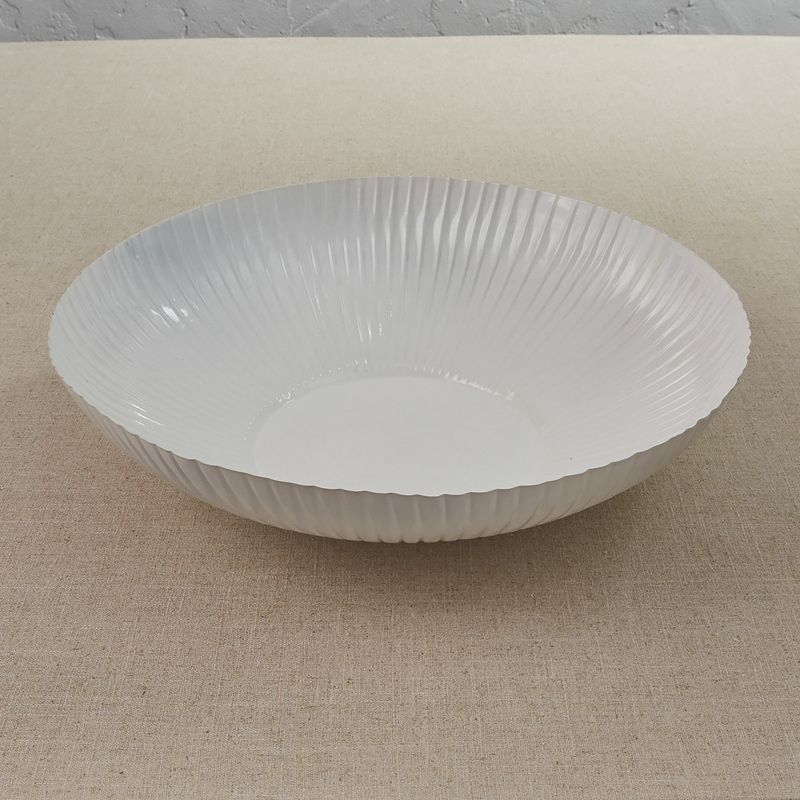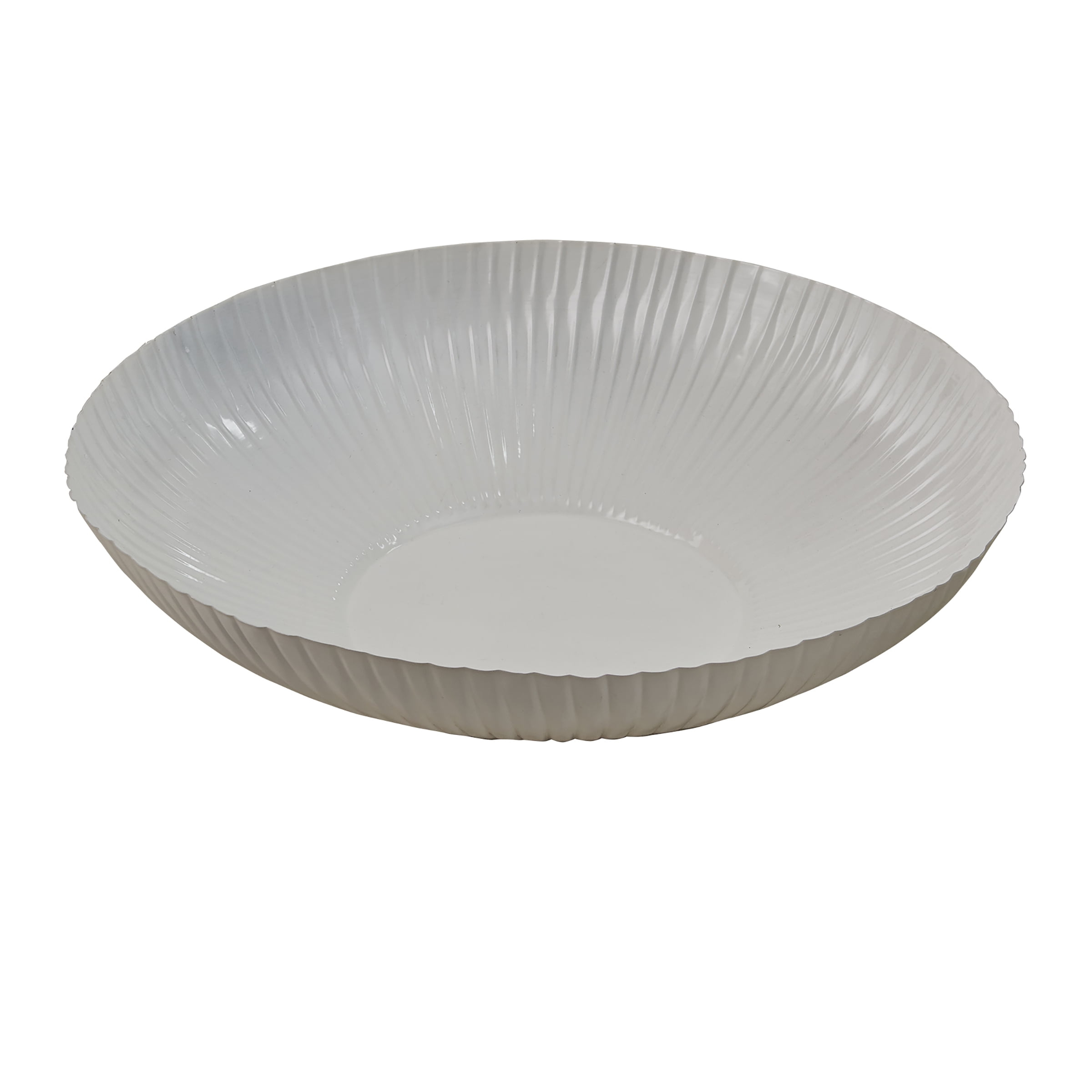 Enhance your home decor with this versatile White Corrugated Metal Bowl. Measuring 16 inches in diameter, it offers a blend of functionality and style. Perfect for organizing keys, mail, or as a contemporary fruit bowl, its corrugated finish adds rustic charm while maintaining a clean, sophisticated look.