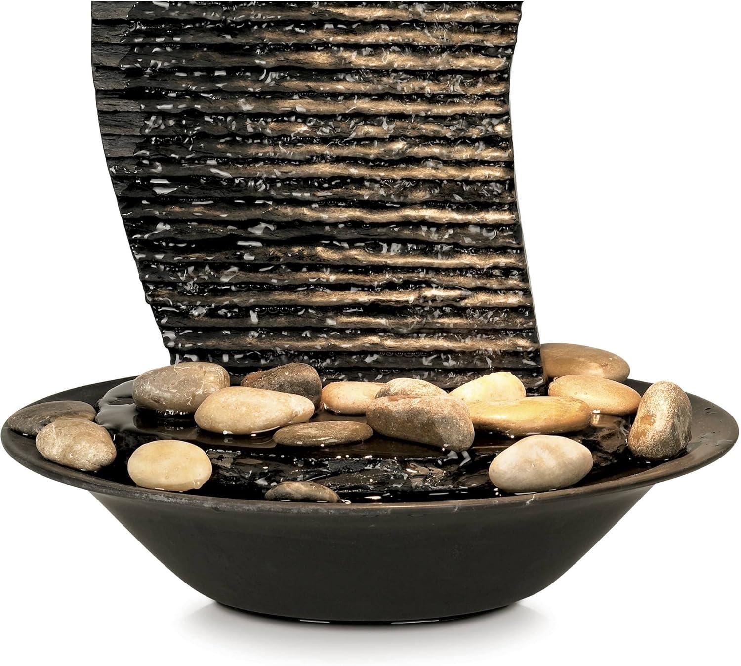Experience tranquility with this Zen tabletop waterfall fountain. Featuring a textured backsplash and real river rocks, it brings the soothing sounds of water to any room. The built-in light illuminates the fountain, creating a serene ambiance perfect for meditation or relaxation.